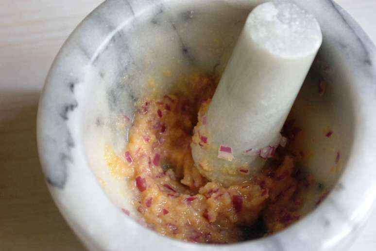 3.フライパンに刻んだ玉ねぎとオリーブオイルを入れ、あまり色づかないように炒めます。やわらかくなったらにんにくも刻み入れて香りが立つまで炒め、お好みで赤唐辛子フレークも加えます。