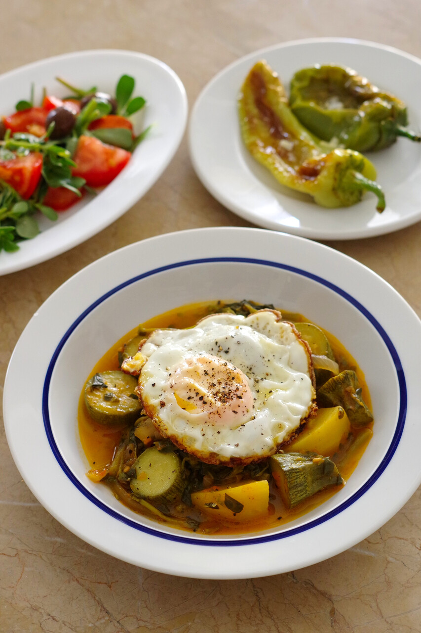 刻んだ玉ねぎとにんにくをオリーブオイルで炒め、好みで唐辛子フレークも少々。やわらかくなったらトマトを加え炒め煮にします。完熟トマトならそれだけでもいいけど、そうでなければトマトペーストも適量炒め、砂糖少々を甘味ブーストの隠し味に。トマトが崩れソースっぽくなったら、刻んだ青菜を加えくたっとするまで煮込みます。味つけは塩と好みで胡椒も適量。自分用には卵を落として仕上げました。