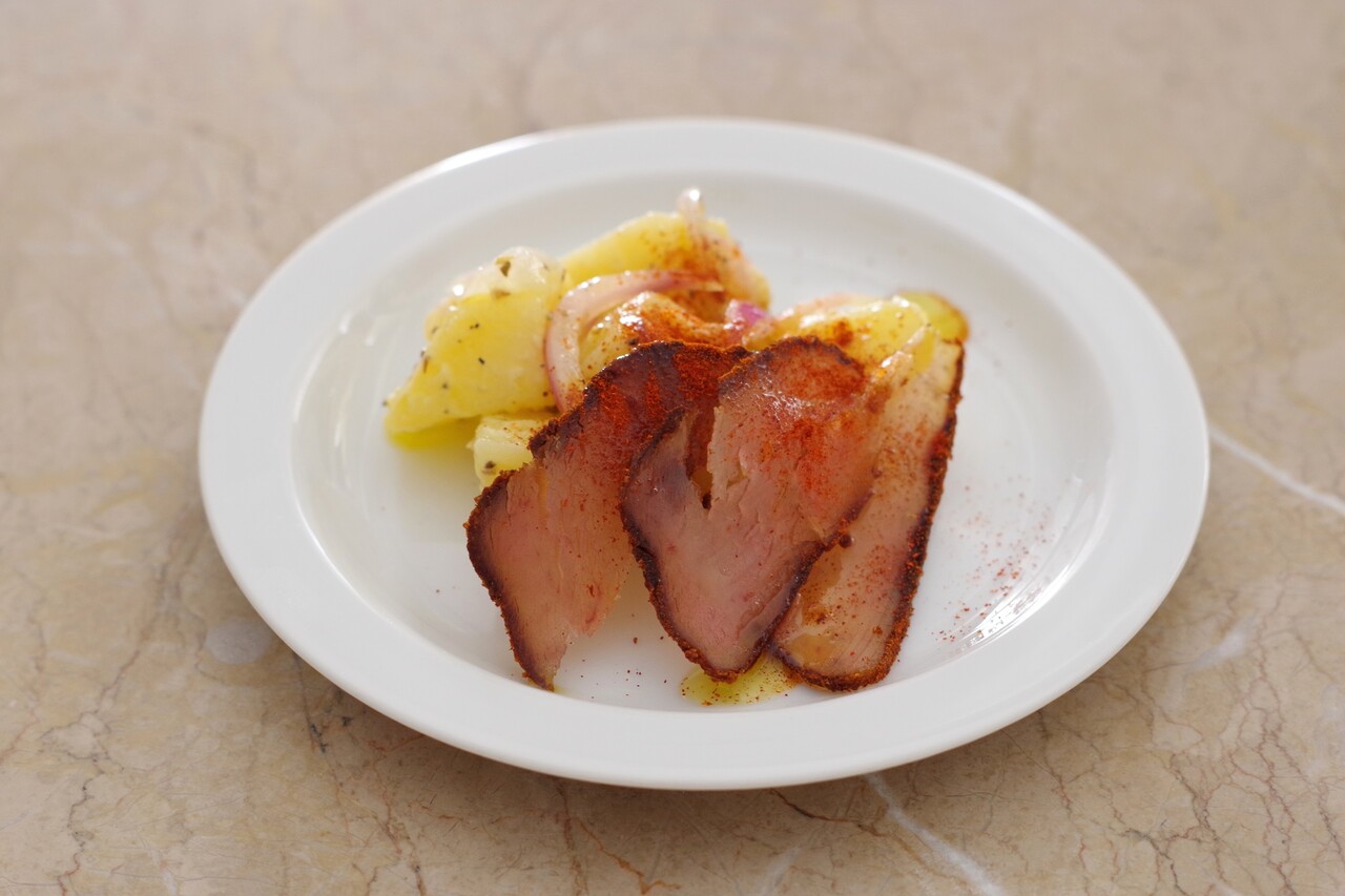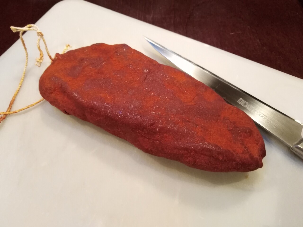 そして、冷蔵庫で1週間くらい乾燥させたでしょうか(冷蔵庫がパストゥルマ臭くなるかなと少々心配だったけど、大丈夫でした)。切ってみると、前に作ったのよりいい感じ。そのままでも素晴らしいメゼですが、せっかくなので料理との組み合わせを楽しんでみることにしましょう。
