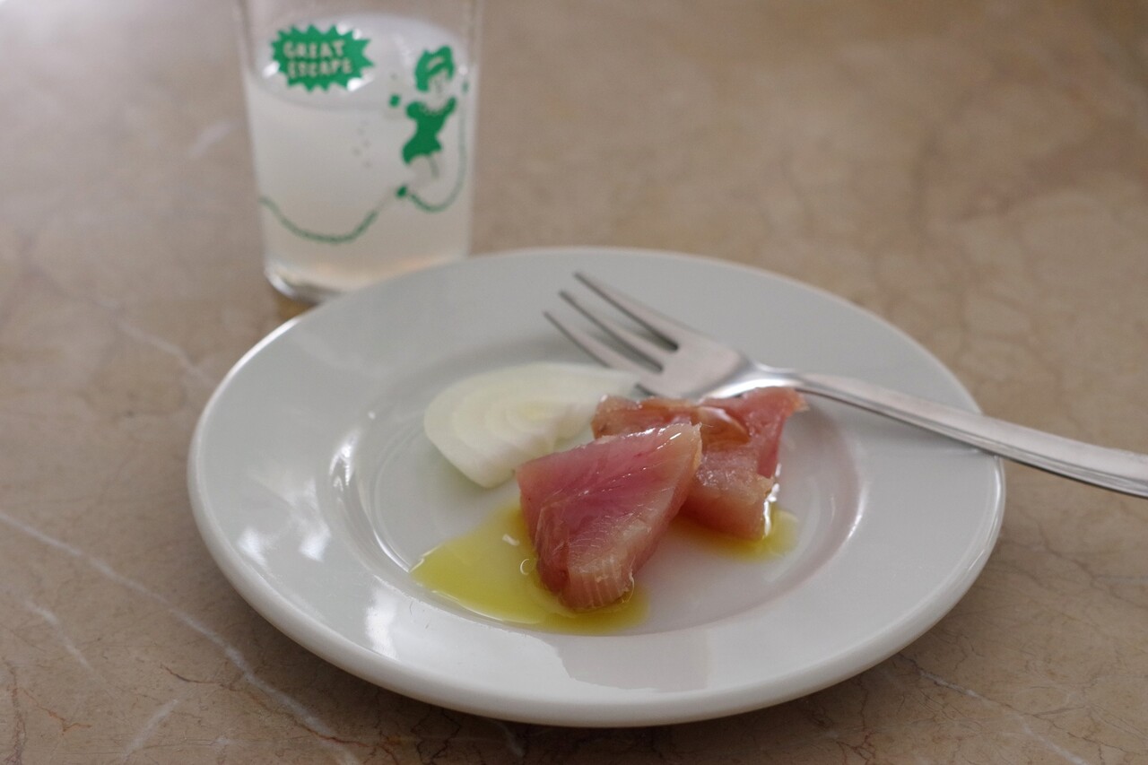 レンズ豆とビーツのサラダ、そして暑いからビーツのガスパチョも作ったのですが、どちらかというとガスパチョに合わせたくなりました(豆サラダに魚の加工品は普段からよく食べてるし)。